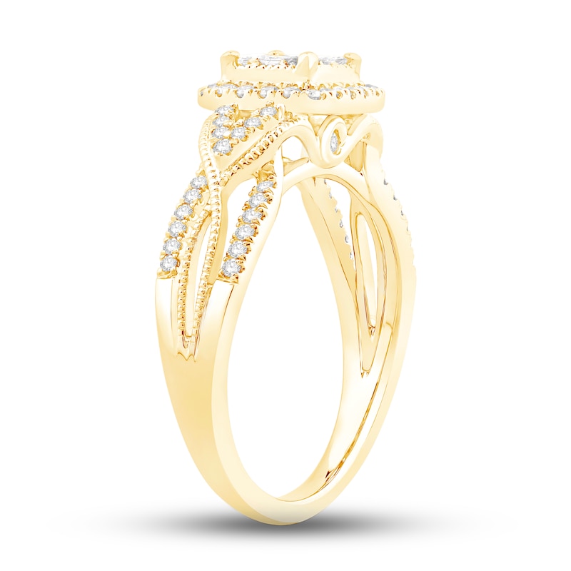 A stunning cluster of sparkling princess-cut diamonds take center stage in this gorgeous multi-diamond engagement ring. Set in timeless 10K yellow gold, brilliant round diamonds frame the center and weave down the twisted band for a total diamond weight of 1/2 carat. Classic milgrain detailing finishes the chic design. From the Now & Forever® bridal collection.