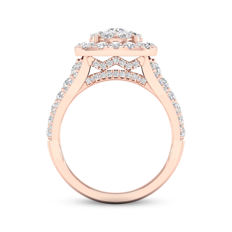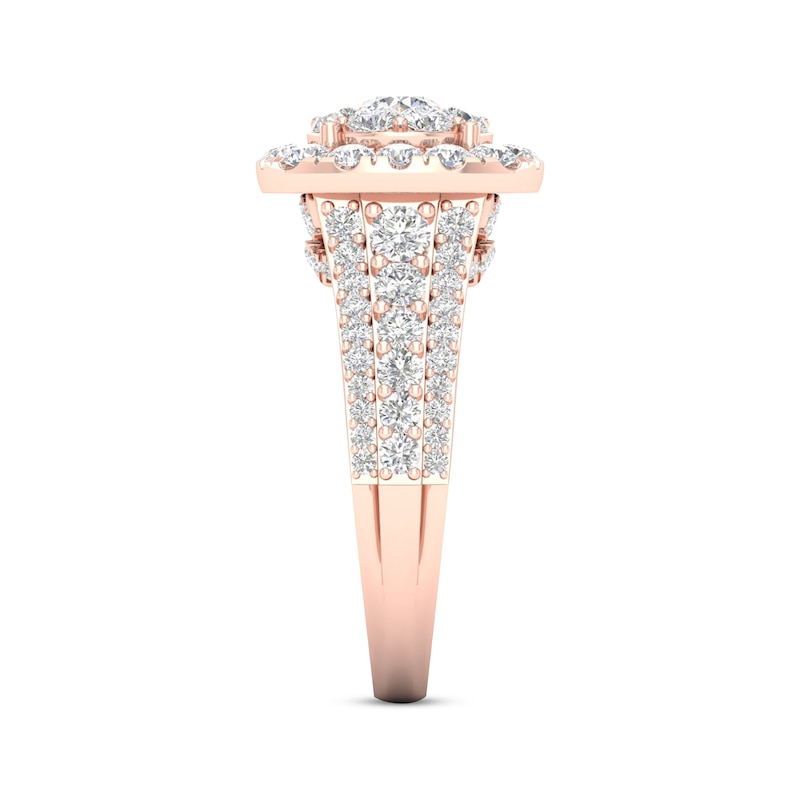Resplendent with 2 carats of radiant diamonds, this gorgeous engagement ring will easily win their heart. A 1/3-carat round diamond is the mesmerizing focal point and is brightly enveloped by a double frame of round diamonds at the center. Three rows of round diamonds dance halfway down the band, while more round diamonds shimmer across the bridge and gallery. The ring is styled in romantic 18K rose gold and is from our Now & Forever® bridal collection.