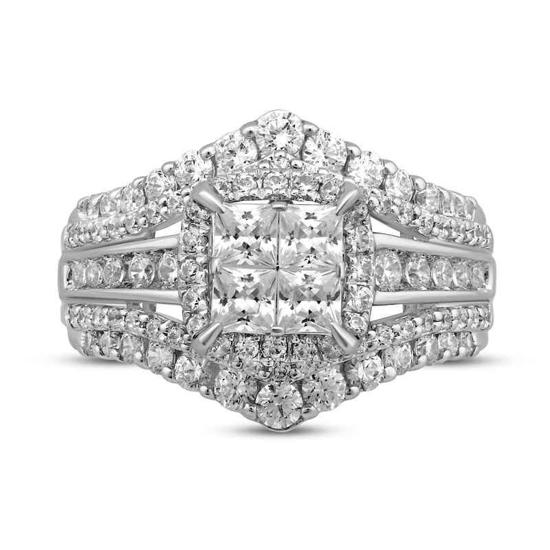 Four stunning princess-cut diamonds shine at the center of this beautiful engagement ring for her. Set in iconic 14K white gold, brilliant round diamonds frame the center setting and shimmer down the sides of the band in multiple rows. The ring has a total diamond weight of 2 carats. From the Now & Forever® bridal collection.