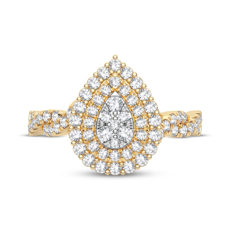 A radiant symbol of your love, this splendid engagement ring showcases a cluster of dainty round-cut diamonds styled in white rhodium at the center. Two bold and bright haloes of more round diamonds surround the pear-shaped silhouette to dramatic and dazzling effect. Ribbons of round diamonds weave down the 10K yellow gold band, giving the ring a total diamond weight of 3/8 carat. From the Now & Forever® bridal collection.