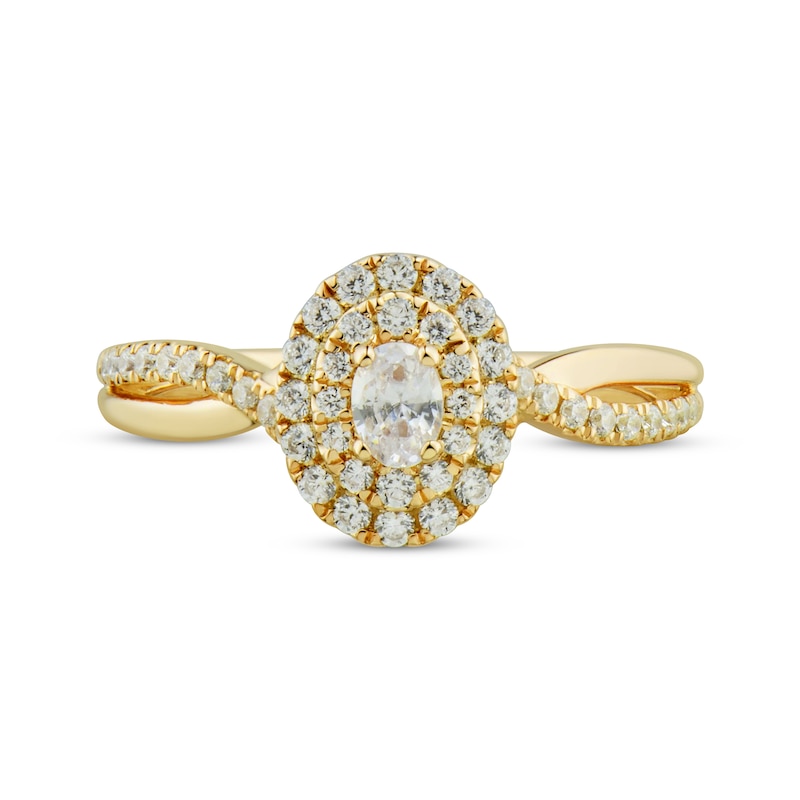 Propose in style with this unique engagement ring. Centered with an oval-cut diamond stacked atop two haloes of round-cut diamonds, the bypass look shimmers with more round diamonds along the split twist shank. Crafted in 14K yellow gold, the design has a total diamond weight of 1/2 carat. From the Now & Forever® bridal collection.