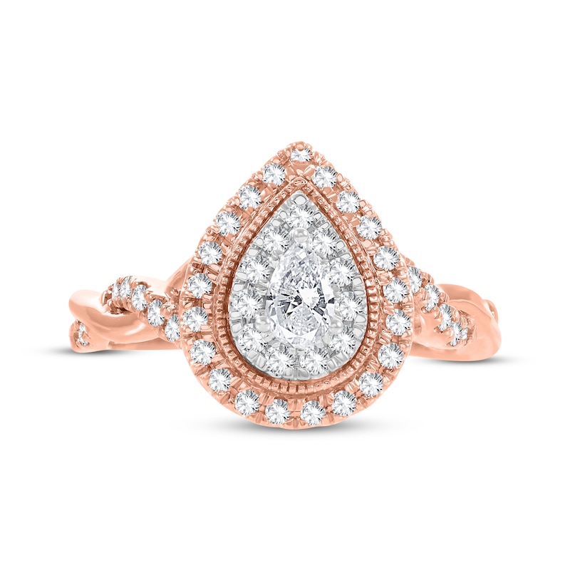 This beautiful engagement emits a chorus of sparkle. Showcased at the center is a bright pear-shaped diamond wrapped by two halos of radiant round-cut diamonds. Additional round diamonds dance down the twisting sides of the 14K rose gold setting with milgrain detailing. The ring has a total diamond weight of 5/8 carat and is featured in our Now & Forever® bridal collection.