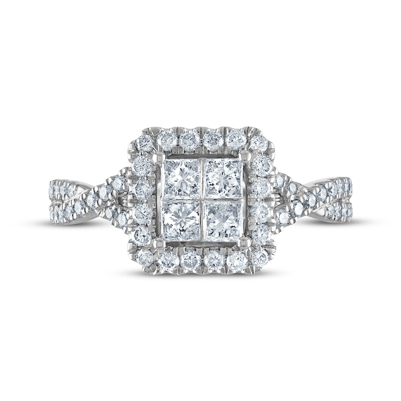 This shimmering engagement ring is just her style. Crafted in 14K white gold, the design is centered with a quartet of princess-cut diamonds wrapped in a cushion-shaped halo frame of round-cut diamonds. More round-cut diamonds dazzle along sides of the halo and down the twist split shank. This tasteful ring has a total diamond weight of 1 carat. From the Now & Forever® bridal collection.