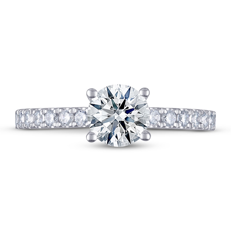 Introducing THE LEO® Ideal Cut Diamond, a rare diamond of geometrically perfect proportions that releases the maximum amount of fire, sparkle and brilliance – to let your unique love for each other truly shine through. This classic diamond engagement ring for her features a 1-carat independently-certified, round-cut Ideal Cut Diamond at its center, with more round diamonds sparkling down each side of the 14K white gold band. The ring boasts a total diamond weight of 1 1/4 carats. The independently certified center diamond is laser-inscribed with a unique Gemscribe® serial number to ensure your peace of mind.