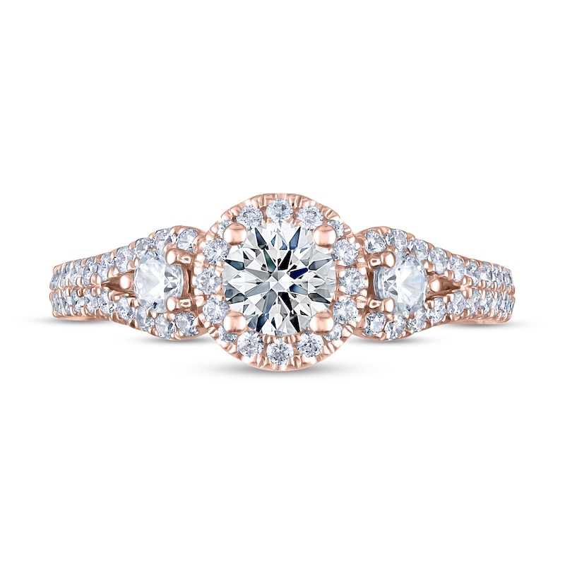 Introducing THE LEO® Ideal Cut Diamond, a rare diamond of geometrically perfect proportions that releases the maximum amount of fire, sparkle and brilliance – to let your unique love for each other truly shine through. This extraordinary 3-stone engagement ring for her features three brilliant round-cut diamonds at its center, the middle enhanced by a beautiful halo of round diamonds. More round diamonds shimmer down each side of the band for a total diamond weight of 1 carat. The ring is crafted in iconic 14K rose gold. The independently certified center diamond is laser-inscribed with a unique Gemscribe® serial number to ensure your peace of mind.