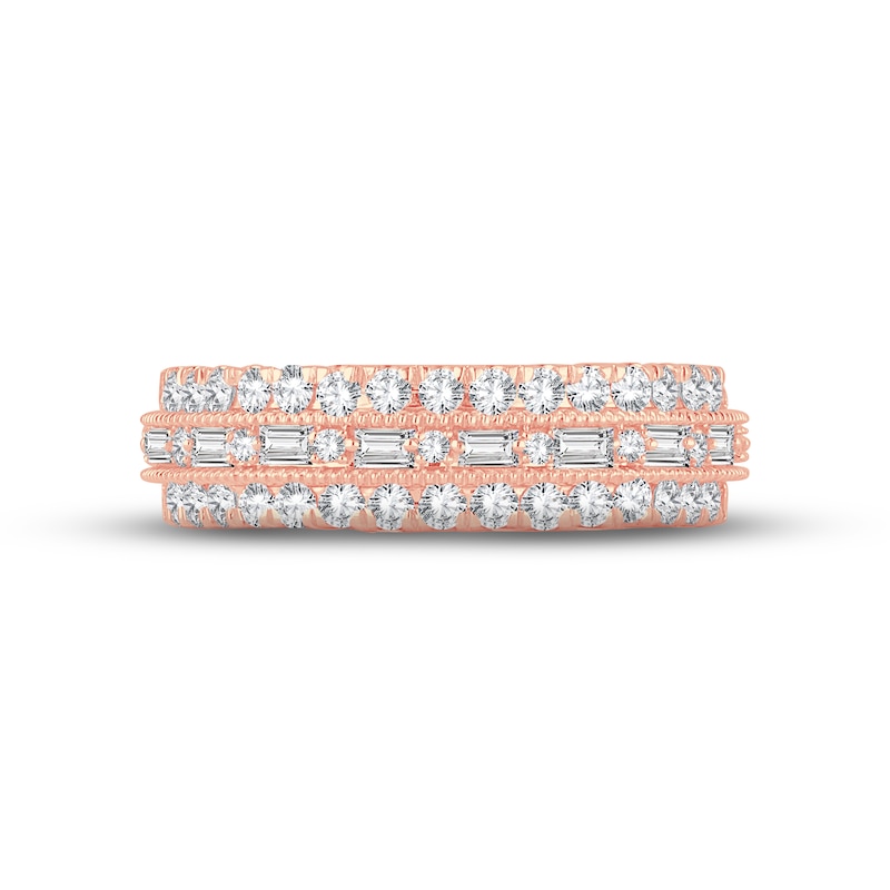 Celebrate your one-of-a-kind love with this radiant anniversary ring for her. Styled in romantic 14K rose gold, round and baguette-cut diamonds round and baguette-cut diamonds alternate down the middle, encircling the ring. Brilliant round diamonds sparkle around the top and bottom edges of the band for a total diamond weight of 1 1/2 carats. From the Now & Forever® bridal collection.