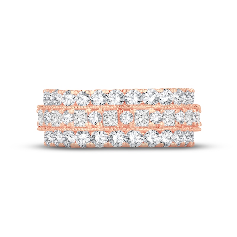 Show your unending devotion with a gorgeous eternity ring, perfect for celebrating a special anniversary. Luminous round and princess-cut diamonds comprise a center row that wraps around the band, while rows round diamonds encircle the top and bottom edges. Crafted in lovely 14K rose gold, the ring has an incredible total diamond weight of 4 carats. From the Now & Forever® bridal collection.