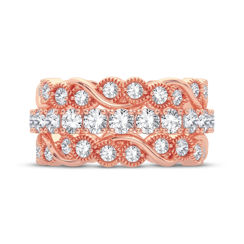 Celebrate your enduring love with this exceptional eternity ring. Created in 14K rose gold, this braided multi-row look features heirloom-inspired milgrain detailing along the center ribbon of round diamonds. Polished bands and smaller round diamonds weave interest and sparkle into the dramatic design. This sweeping style has a total diamond weight of 3 carats. From the Now & Forever® bridal collection.
