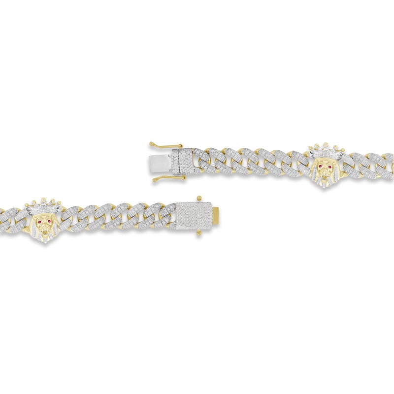 Bring out your kingly nature with this majestic bracelet. Stationed along a bold curb chain, three sculpted lion heads are embellished by bright round diamonds and fiery round lab-created rubies. Diamond-encrusted crowns complete the regal look, while more round diamonds gleam on the chunky chain. Styled in polished 10K yellow gold with white rhodium, the bracelet has a total diamond weight of 1 carat. The 8.5-inch chain secures with a box clasp.