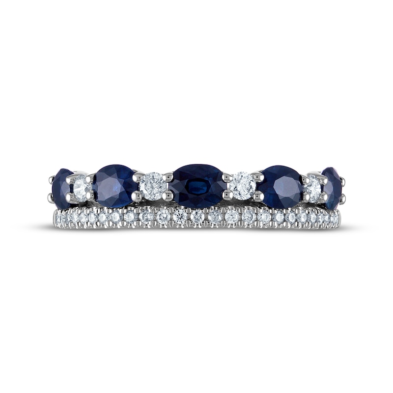 Let your true love know you adore her more than ever with this exceptional anniversary band. Regal oval-cut sapphires alternate with dainty round diamonds along the top of the band, while more round diamonds sparkle along the bottom. The ring is crafted in lustrous 10K white gold and has a total diamond weight of 1/4 carat. From the Now & Forever® bridal collection.