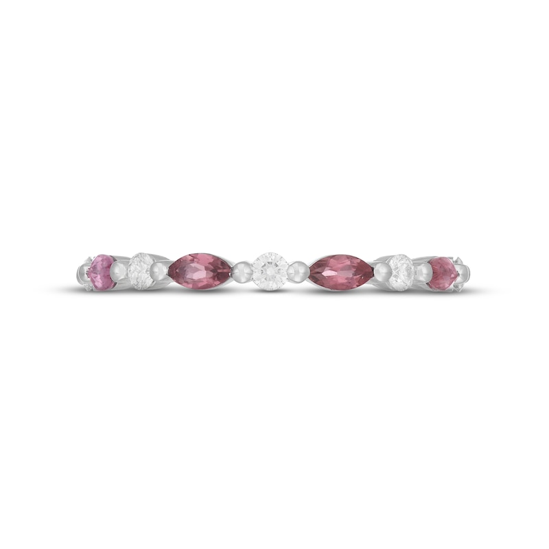 This spellbinding anniversary ring from Neil Lane Bridal® showcases rich marquise-cut pink tourmalines alternating with radiant round diamonds. The 14K white gold band is embellished by classic milgrain detailing and has a total diamond weight of 1/6 carat.