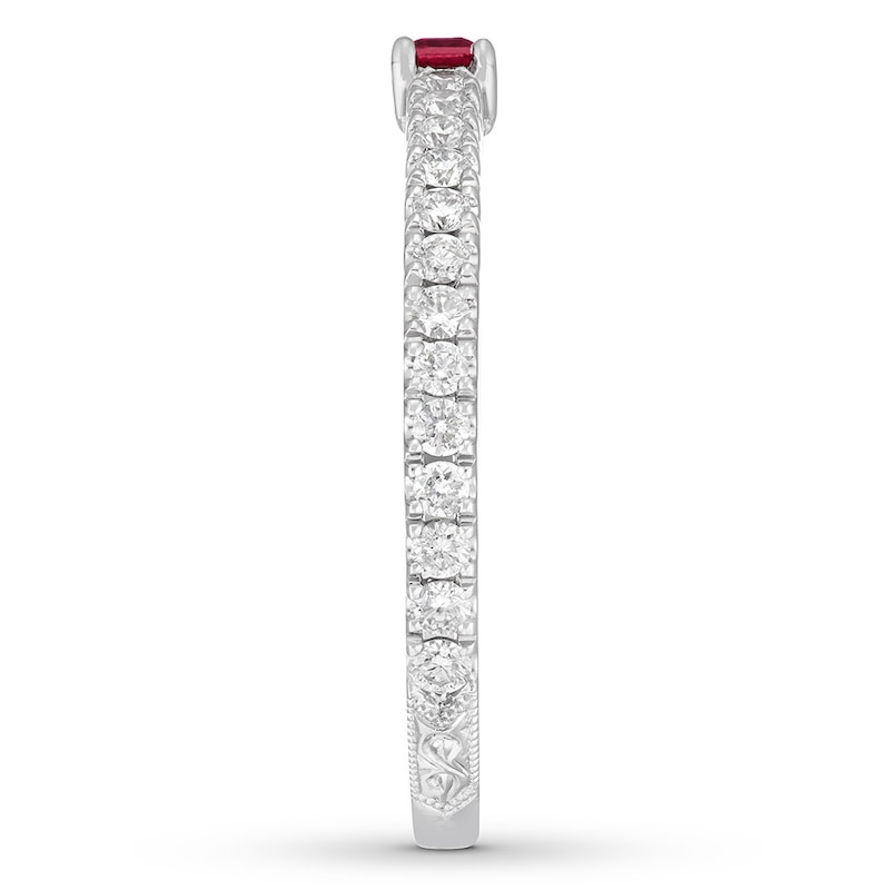 Contemporary yet unexpected, this elegant anniversary band from the Neil Lane Bridal® collection displays a baguette natural ruby set east to west on a band lined with sparkling round diamonds. Milgrain beading and carved details complete the look. Fashioned in 14K white gold, the ring has a total diamond weight of 1/3 carat.