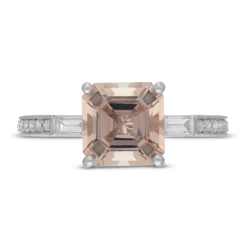 An ethereal square emerald-cut morganite gemstone shines at the center of this blush-toned engagement ring for her. Set in iconic 14K white gold, the band sparkles with baguette and round-cut diamonds totaling 3/8 carat in weight. Classic milgrain detailing finishes the look. From the Neil Lane Bridal® collection.