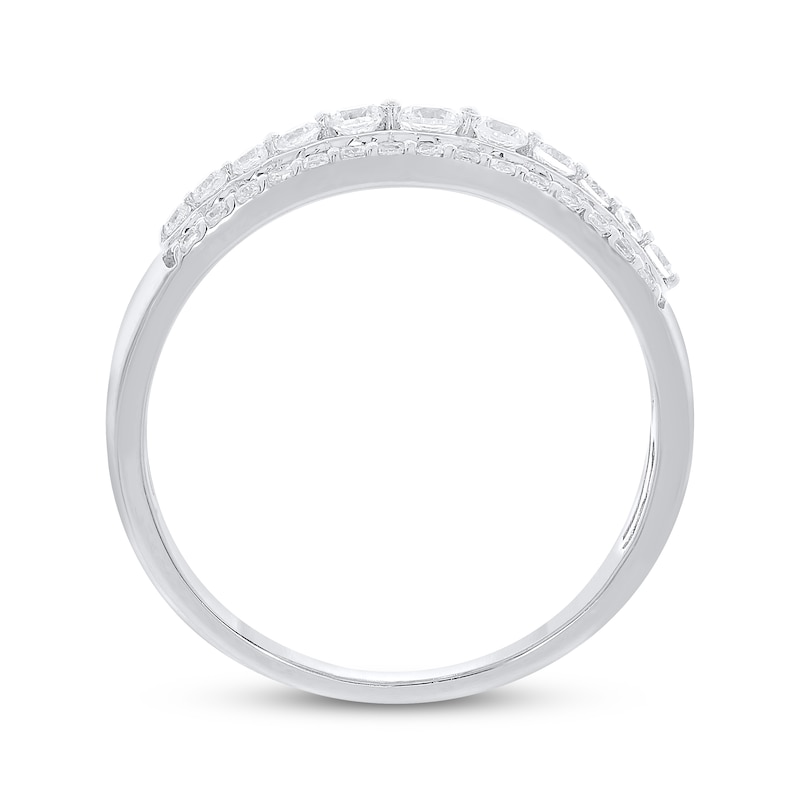 Tell her you'd marry her all over again with this diamond anniversary band. Crafted in 10K white gold, this band features a center row of graduated-size round diamonds flanked by ribbons of round diamonds. Set with 1/2 carat total diamond weight, this ring celebrates your special day. From the Now & Forever® bridal collection.