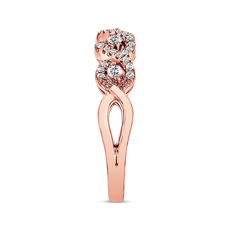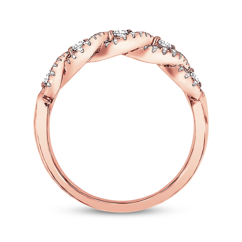 This gorgeous anniversary band for her displays five round diamonds wrapped in sparkling twists of diamonds. The 14K rose gold ring has a total diamond weight of 1/3 carat.