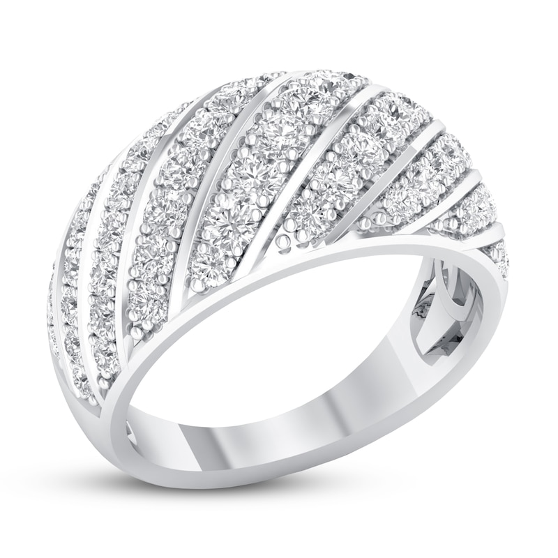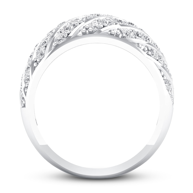 Alternating rows of 10K white gold and glittering round diamonds form this beautiful and dynamic women's anniversary band. The rows of diamond wrap gracefully around the band, giving the ring a total diamond weight of 1 carat. From the Now & Forever® bridal collection.