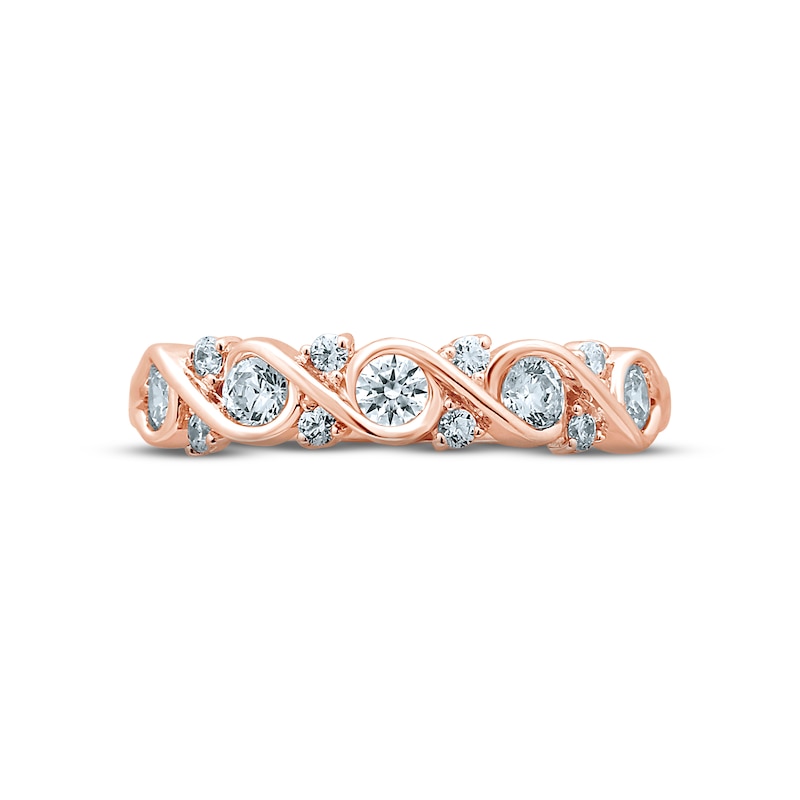 Enchanting swirls of 14K rose gold wrap around radiant round-cut diamonds in this resplendent anniversary ring for her. Dainty round-cut diamonds are scattered along the band for extra sparkle, giving the ring a total diamond weight of 1/2 carat. From the Now and Forever® bridal collection.