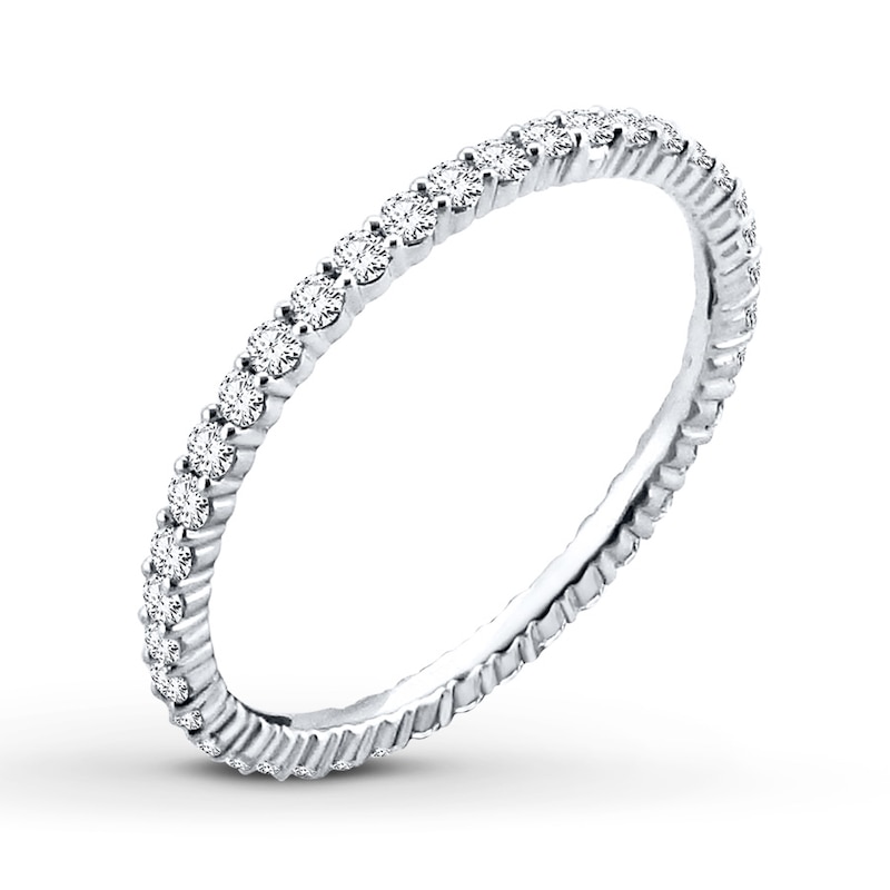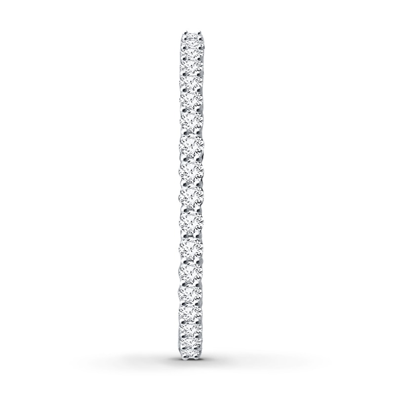 Sparkling round diamonds encircle the band of this eternity ring, suggesting a love that never ends. Styled in 14K white gold, the anniversary ring has a total diamond weight of 1/2 carat.