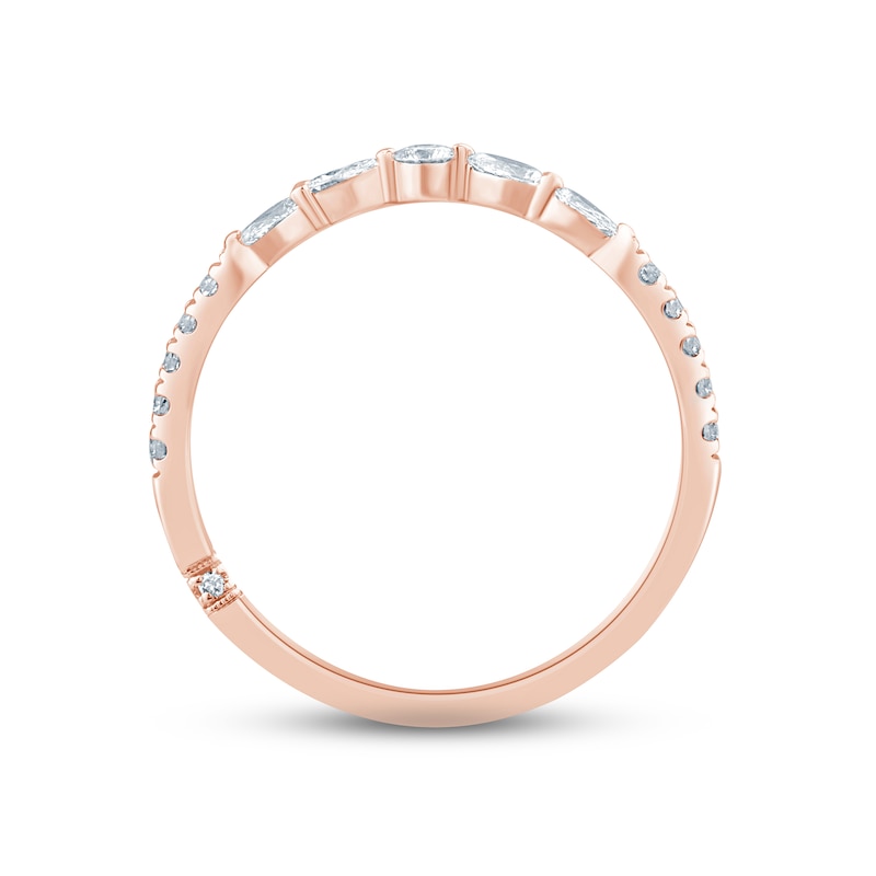Glittering round and pear-shaped diamonds shine along the top of this exquisite anniversary band. More round diamonds grace both sides of the gently tapered band, which is crafted in lovely 18K rose gold. The ring has a total diamond weight of 1/3 carat, and the diamonds are independently certified. From the Monique Lhuillier Bliss collection, available exclusively at KAY. Please note: This ring is available in limited sizes. If you don't see your size here, please visit a store to order your ring.