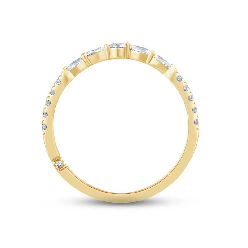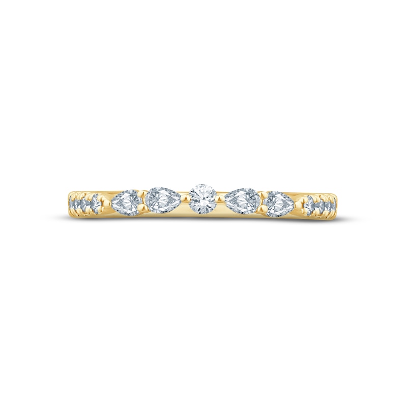Glittering round and pear-shaped diamonds shine along the top of this exquisite anniversary band. More round diamonds grace both sides of the gently tapered band, which is crafted in gleaming 18K yellow gold. The ring has a total diamond weight of 1/3 carat, and the diamonds are independently certified. From the Monique Lhuillier Bliss collection, available exclusively at KAY. Please note: This ring is available in limited sizes. If you don't see your size here, please visit a store to order your ring.