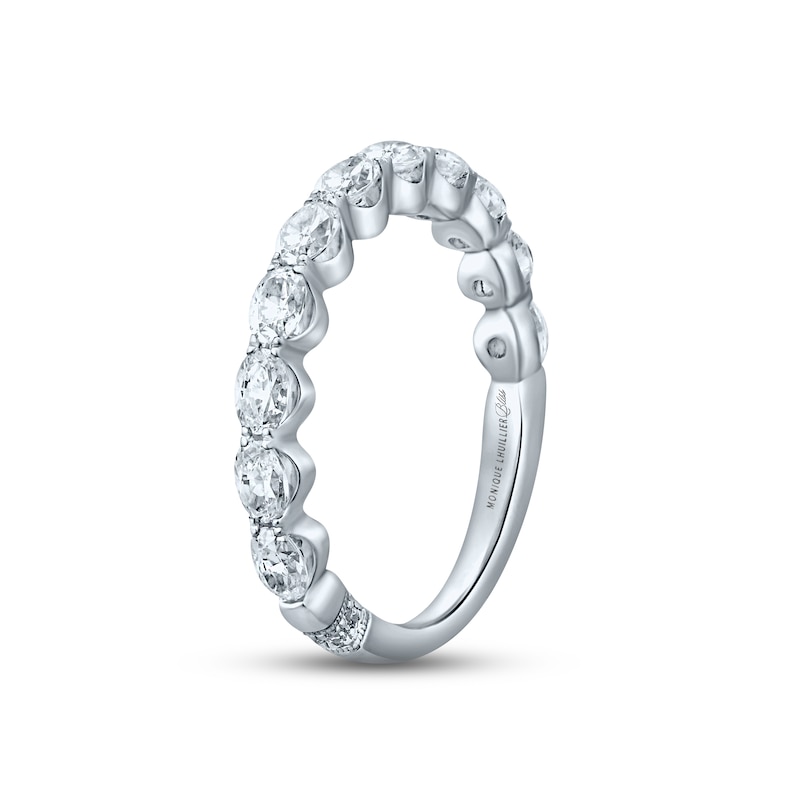 This elegant wedding band features a series of sparkling oval-cut diamonds embraced by a gleaming 18K white gold band. With four round-cut diamonds completing the signature look, the ring has a total diamond weight of 1 carat. From the Monique Lhuillier Bliss collection, available exclusively at KAY. Please note: This ring is available in limited sizes. If you don't see your size here, please visit a store to order your ring.