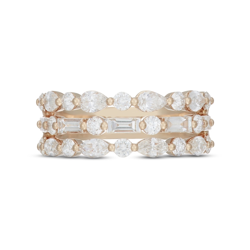 This gorgeous Neil Lane™ Premiere anniversary ring for her features three rows of brilliant independently-certified round-cut, pear-shaped and baguette-cut diamonds. The 14K yellow gold ring has a total diamond weight of 2 carats and is finished with classic milgrain detailing.