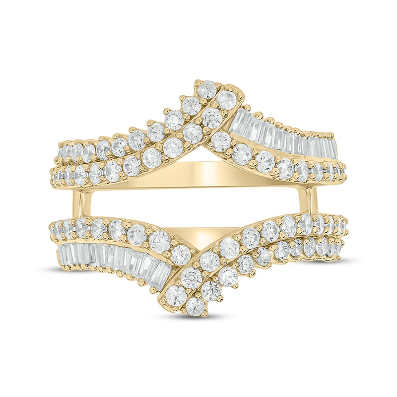 Create a striking new look for your engagement ring (sold separately) with this dazzling enhancer ring. Crafted in 14K yellow gold, the curved chevron design shimmers with double rows of round-cut diamonds that cross over curved baguette- and round-cut diamond ribbons. This sparkling style has a total diamond weight of 1 carat. From the Now & Forever® bridal collection.