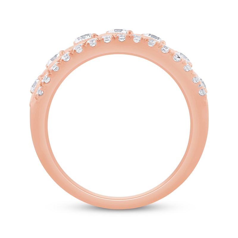A mesmerizing design of round diamonds are on display in this beautiful and unique women's anniversary band. Crafted in romantic 10K rose gold, the ring has an impressive total diamond weight of 1 carat. From the Now & Forever® bridal collection.