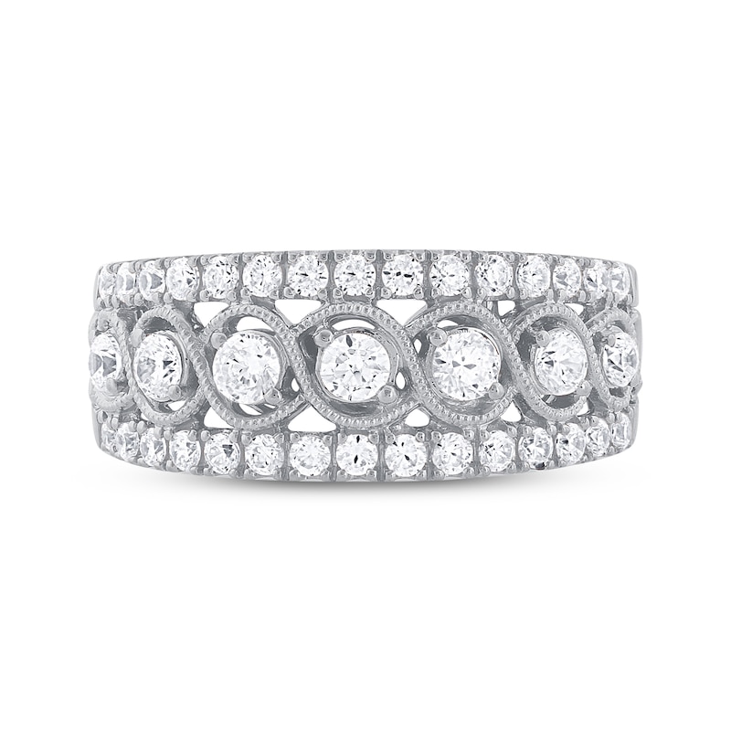 A mesmerizing design of round diamonds are on display in this beautiful and unique women's anniversary band. Crafted in 10K white gold, the ring has an impressive total diamond weight of 1 carat. From the Now & Forever® bridal collection.