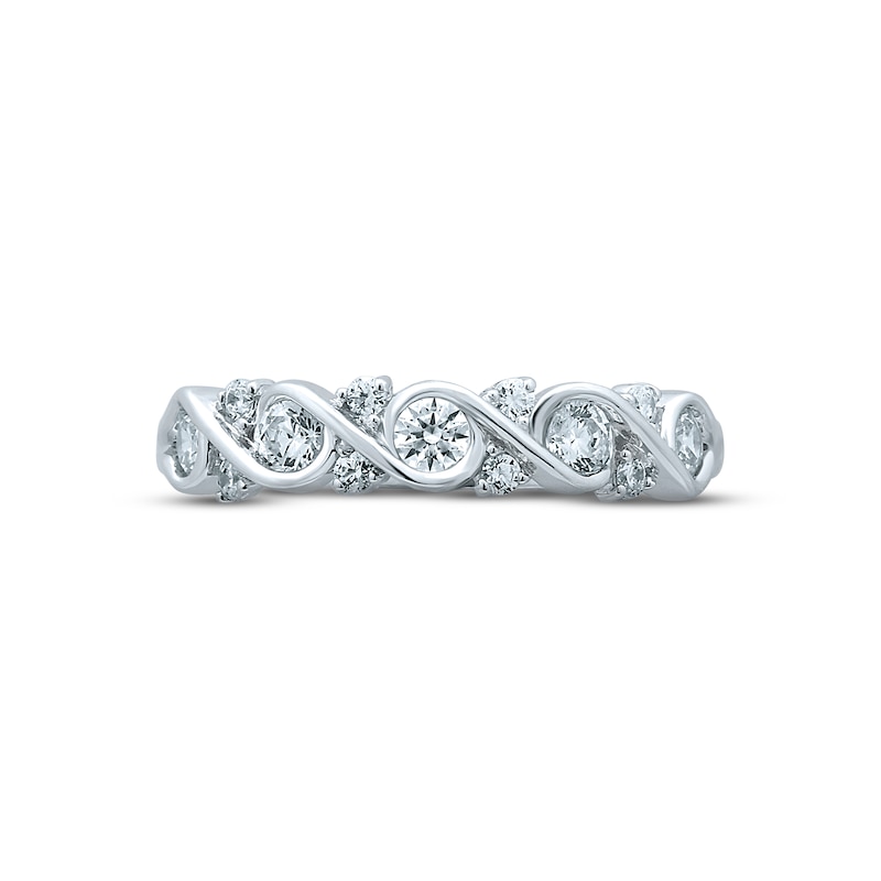 Shining swirls of 14K white gold weave around glittering round-cut diamonds in this alluring anniversary ring for her. Dainty round diamonds twinkle at the edges and give the ring a total diamond weight of 1/2 carat. From the Now and Forever® bridal collection.