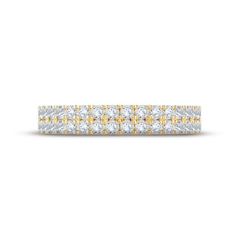 Two rows of shimmering round diamonds adorn this lovely anniversary ring for her. Styled in 14K yellow gold, the ring has a total diamond weight of 1/2 carat. From the Now and Forever® bridal collection.