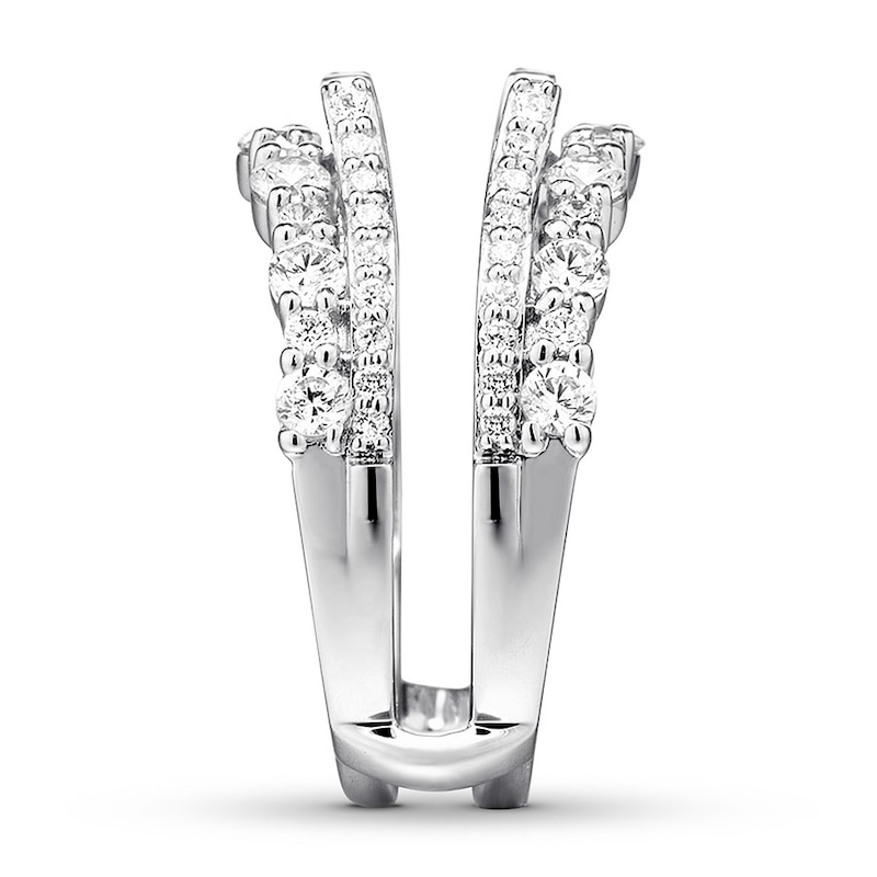 Declare your love forever with this amazing enhancer ring. Dazzling ribbons of round diamonds gracefully sweep above and below the space for her diamond solitaire or engagement ring (sold separately). Fashioned in 14K white gold, the ring has a total diamond weight of 1 1/3 carats.