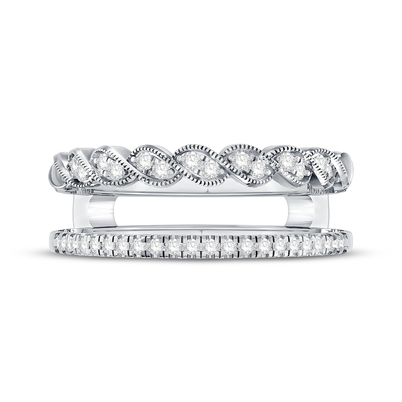Create a dramatic presentation with this diamond solitaire enhancer. Created in 14K white gold, this distinctive design features a bottom band lined with round diamonds and a top band decorated with milgrain-detailed diamond swirls. The style wraps her engagement ring (sold separately) with a total diamond weight of 1/4 carat. From the Now & Forever® bridal collection.