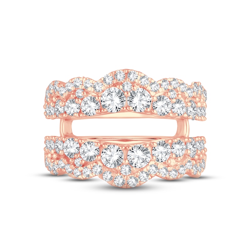 This enthralling enhancer ring showcases an inner row of bright round diamonds that shine above and below the space for her engagement ring (sold separately). Smaller round diamonds shimmer along scalloped contours at the top and bottom edges of the band, which is crafted in 14K rose gold. The ring has a total diamond weight of 2 carats and is from our Now & Forever® bridal collection.