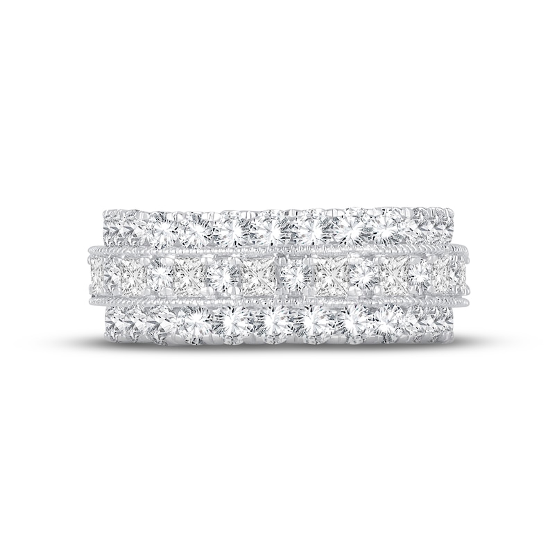 Show your unending devotion with a gorgeous eternity ring, perfect for celebrating a special anniversary. Luminous round and princess-cut diamonds comprise a center row that wraps around the band, while rows of round diamonds encircle the top and bottom edges. Crafted in cool 14K white gold, the ring has an incredible total diamond weight of 4 carats. From the Now & Forever® bridal collection.