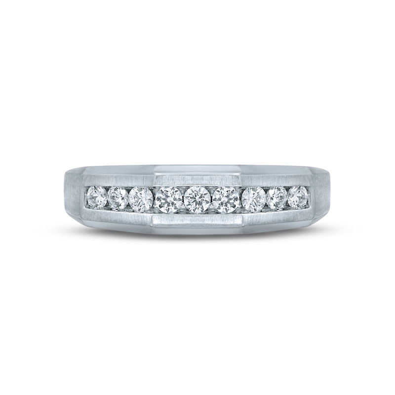This striking wedding band for him is styled in modern 10K white gold and adorned in shining round-cut diamonds. The angled band has a total diamond weight of 1/2 carat and is from our Now and Forever® collection.