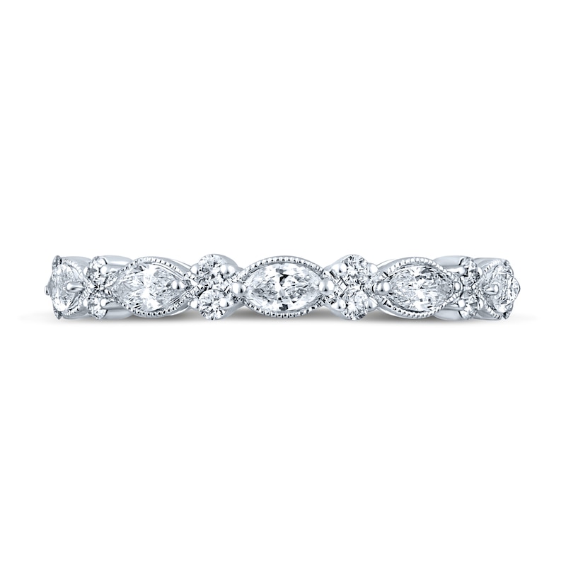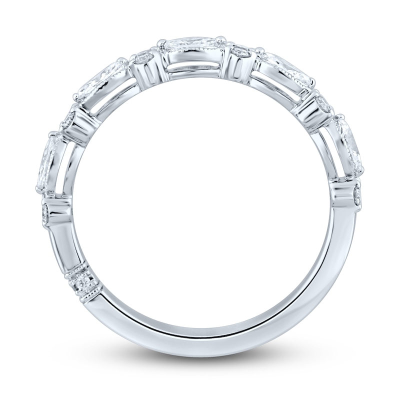 This elegant anniversary band sparkles with a beautiful array of independently-certified marquise and round-cut diamonds. The band is set in iconic 18K white gold and is finished with classic milgrain detailing. The ring has a total diamond weight of 1/2 carat. From the Monique Lhuillier Bliss collection, available exclusively at KAY. Please note: This ring is available in limited sizes. If you don't see your size here, please visit a store to order your ring.
