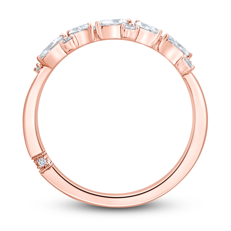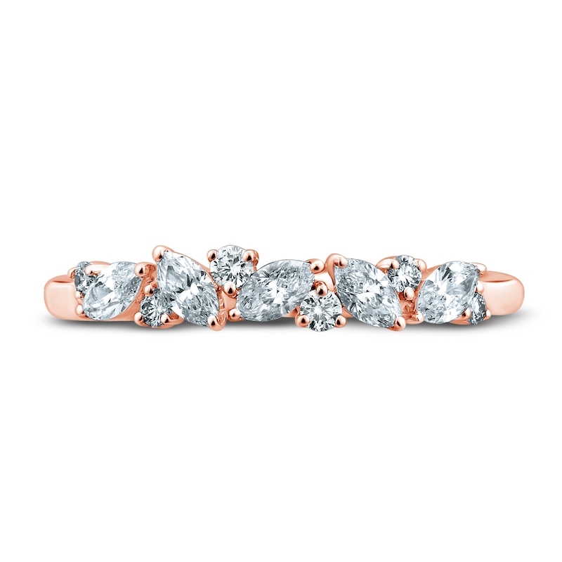 This stunning anniversary band showcases an eye-catching array of independently-certified round and marquise-cut diamonds set in dreamy 18K rose gold. The ring has a total diamond weight of 1/2 carat. From the Monique Lhuillier Bliss collection, available exclusively at KAY. Please note: This ring is available in limited sizes. If you don't see your size here, please visit a store to order your ring.