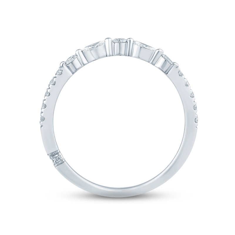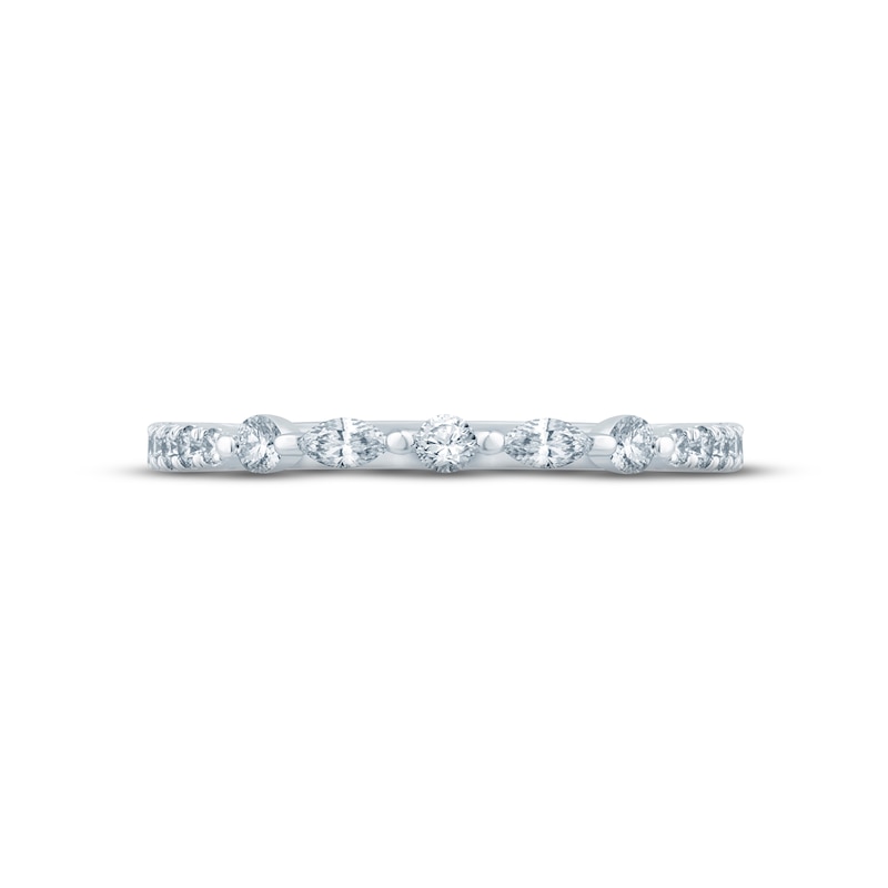 This romantic anniversary band is styled in iconic 18K white gold and showcases radiant round and marquise-cut diamonds alternating on the top. More round diamonds dance down both sides of the band for a total diamond weight of 1/3 carat. The diamonds are independently certified. From the Monique Lhuillier Bliss collection, available exclusively at KAY. Please note: This ring is available in limited sizes. If you don't see your size here, please visit a store to order your ring.