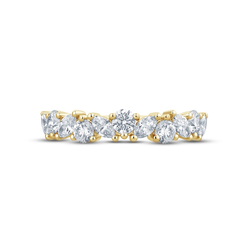 Sparkling marquise and round-cut diamonds alternate along this marvelous anniversary band. Styled in timeless 18K yellow gold, the ring has a total diamond weight of 1 carat. The diamonds are independently certified. From the Monique Lhuillier Bliss collection, available exclusively at KAY. Please note: This ring is available in limited sizes. If you don't see your size here, please visit a store to order your ring.