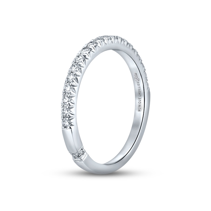 This exquisite wedding band showcases a row of sparkling round-cut diamonds and milgrain detailing. Styled in lustrous 18K white gold, the ring has a total diamond weight of 1/3 carat. From the Monique Lhuillier Bliss collection, available exclusively at KAY. Please note: This ring is available in limited sizes. If you don't see your size here, please visit a store to order your ring.