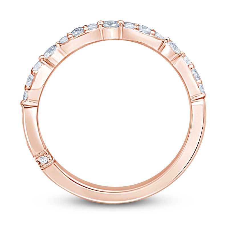 This beautiful diamond wedding band features a row of independently-certified round diamonds set in dreamy 18K rose gold. The ring is crafted to complement her matching engagement ring (sold separately). From the Monique Lhuillier Bliss collection, available exclusively at KAY. Please note: This ring is available in limited sizes. If you don't see your size here, please visit a store to order your ring.