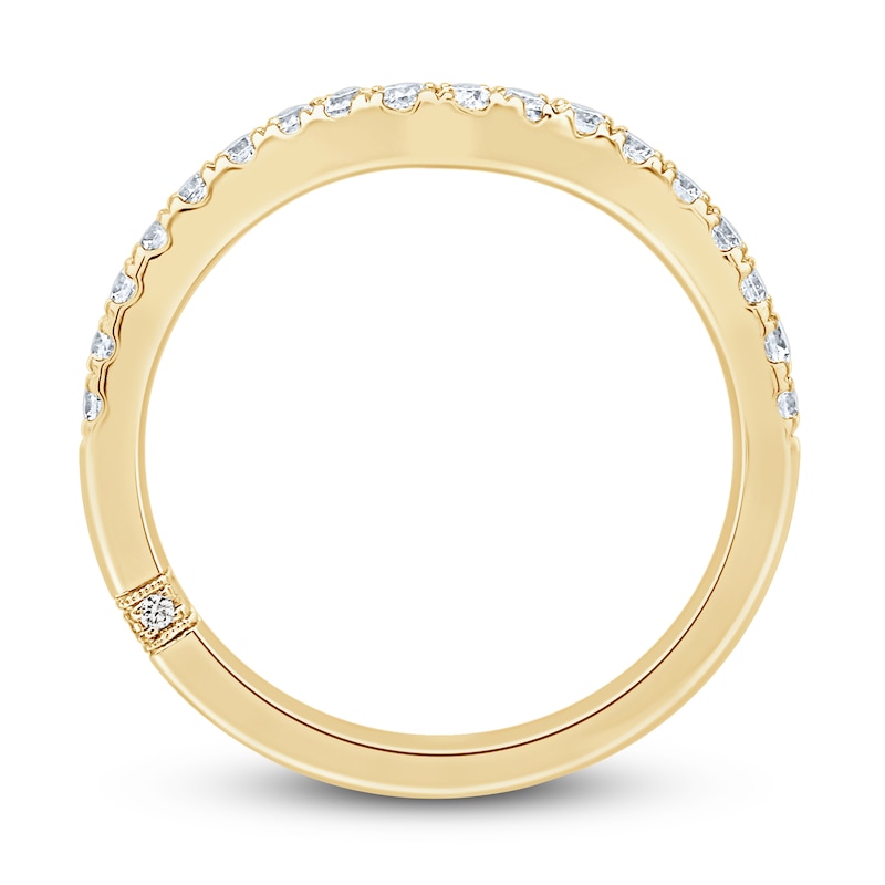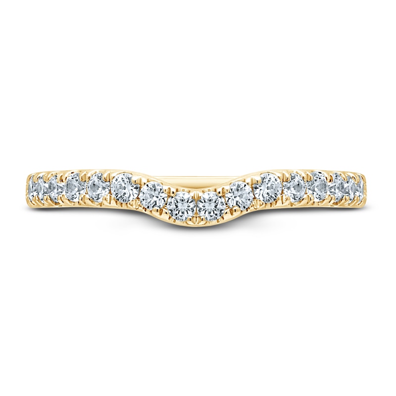 This beautiful wedding band features a contoured design set in timeless 18K yellow gold and complements her matching engagement ring (sold separately). Brilliant round independently-certified diamonds line the band for a total diamond weight of 3/8 carat. From the Monique Lhuillier Bliss collection, available exclusively at KAY. Please note: This ring is available in limited sizes. If you don't see your size here, please visit a store to order your ring.