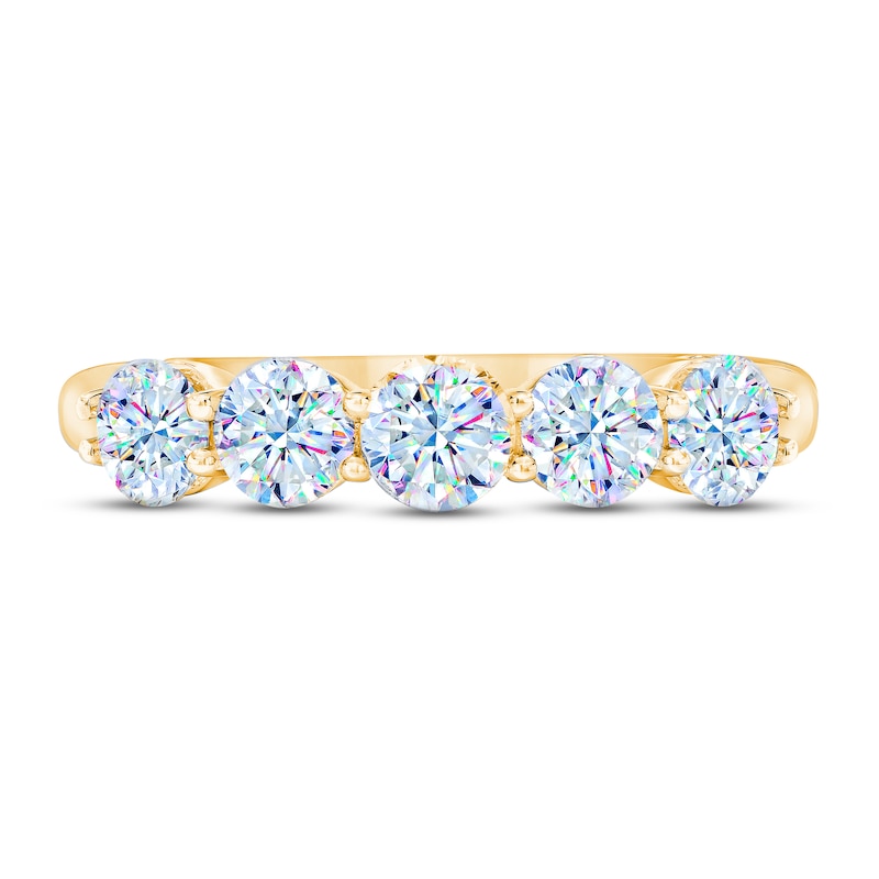This resplendent anniversary band for her displays five radiant First Light® diamonds styled in classic 14K yellow gold. From Leo Schachter, the independently-certified diamonds feature Fire Prism™ technology that creates infinite flashes of color for more fire and sparkle. The ring has a total diamond weight of 1 1/2 carats.