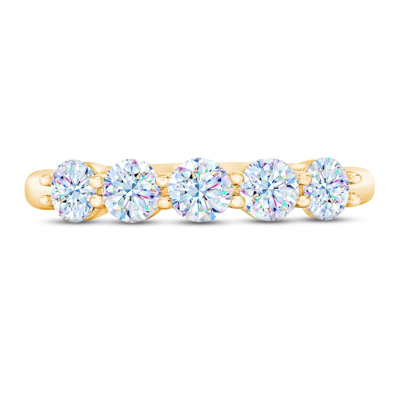 This exquisite anniversary ring for her displays five dazzling First Light® diamonds styled in classic 14K yellow gold. From Leo Schachter, the independently-certified diamonds feature Fire Prism™ technology that creates infinite flashes of color for more fire and sparkle. The ring has a total diamond weight of 1 carat.