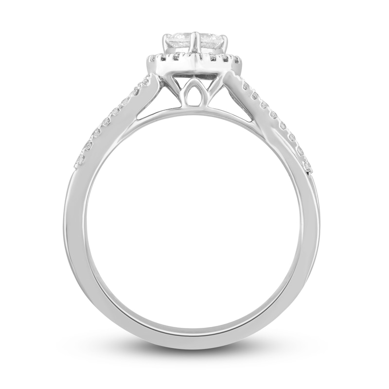 A beautiful 1/3-carat heart-cut diamond shines at the center of this dreamy engagement ring. Set in iconic 14K white gold, brilliant round diamonds halo the center, and more round diamonds shimmer down the twisted band for a total diamond weight of 1/2 carat. From the Now & Forever® bridal collection.