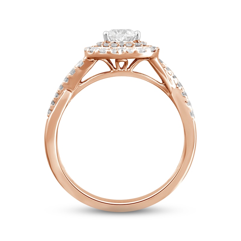Celebrate your beautiful love story with this romantic engagement ring. A 1/3-carat heart-shaped diamond gleams as the focal point, enveloped in a double halo of radiant round diamonds. More round diamonds twist down the elegant band for a total diamond weight of 5/8 carat. The ring is styled in dreamy 14K rose gold with a rhodium finish and is from our Now & Forever® bridal collection.