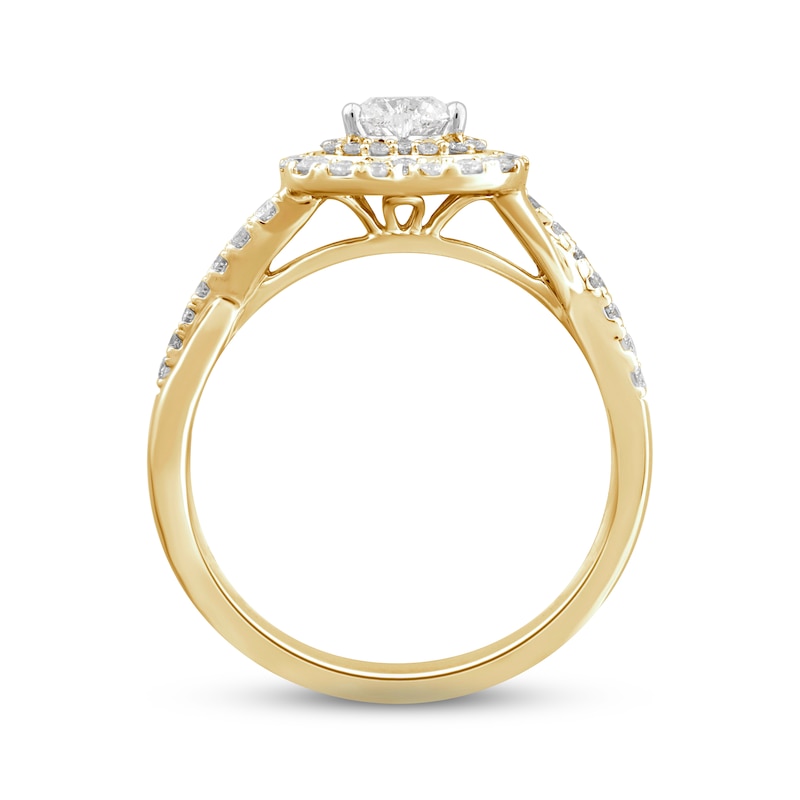 Celebrate your beautiful love story with this romantic engagement ring. A 1/3-carat heart-shaped diamond gleams as the focal point, enveloped in a double halo of radiant round diamonds. More round diamonds twist down the elegant band for a total diamond weight of 5/8 carat. The ring is styled in timeless 14K yellow gold with a rhodium finish and is from our Now & Forever® bridal collection.