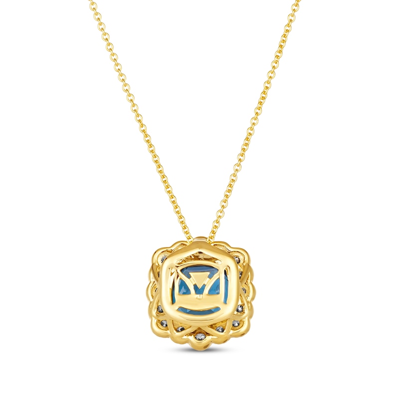 Petite and lovely, this necklace from Le Vian® brings a deep pop of color to your look. Crafted in 14K Honey Gold™, the pendant is centered with a sumptuous round-cut Deep Sea Blue Topaz™ wrapped in an artistic frame of round-cut Nude Diamonds™ for a total diamond weight of 3/8 carat. Fine milgrain detailing lends vintage appeal. This pendant suspends along a 19-inch rolo chain that secures with a lobster clasp. Le Vian®. Discover the Legend.