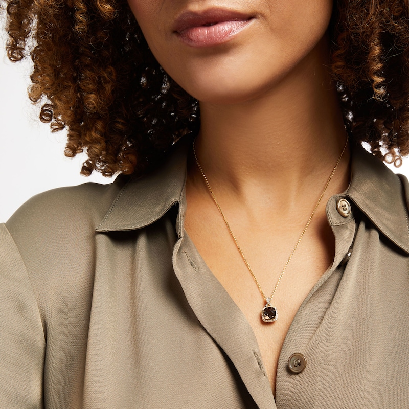 A decadent cushion-cut Chocolate Quartz® is the rich centerpiece of this Le Vian® necklace from the KAY exclusive Chocolate Twist™ collection. Nude Diamonds™ trace the pendant and shimmer up the twisted bail, complemented by delicious Chocolate Diamonds® for a lovely contrast. The necklace is styled in 14K Honey Gold™ and has a total diamond weight of 1/5 carat. The pendant is centered on an adjustable 19-inch rolo chain that fastens securely with a lobster clasp. Le Vian®. Discover the Legend.
